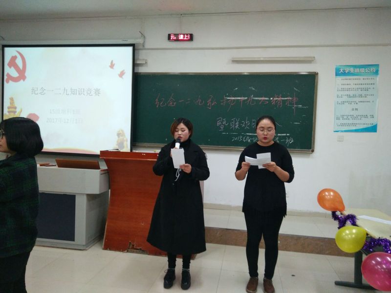 为了缅怀革命先烈,牢记历史,加强学生的爱国主义情怀,地理与旅游学院2015级地理科学一班于2017年11月30日在致远楼301教室举办了“纪念一二•九 弘扬十九大精神”为主题的团日活动。