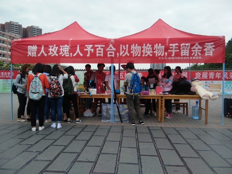 为让闲置物品得到更好的使用,实现资源共享,同时也让同学之间有一个交友的机会,5月17日-18日,由地理与旅游学院基层团委学生会携手环保协会、文化旅游协会在鉴湖旁举行了为期两天的“赠人玫瑰,人予百合,以物换物,手留余香”活动。