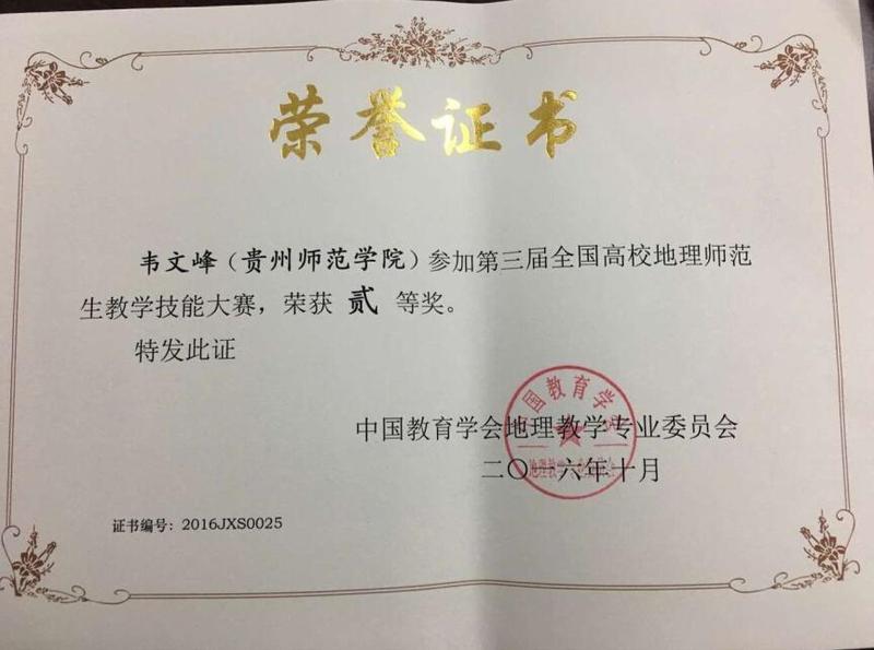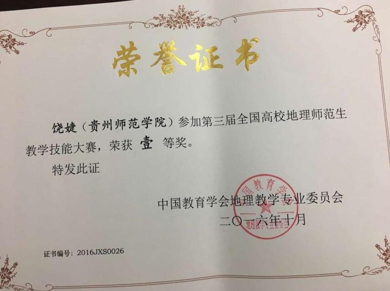 2016年10月12日,第三届全国高校地理师范生“中教启星杯”教学技能大赛在云南师范大学举行,星空官网地理与旅游学院教师郑建带领2013级地理科学专业学生饶婕、韦文峰参加了比赛,饶婕荣获一等奖,韦文峰荣获二等奖。