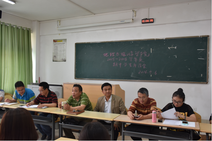 5月6日,地旅学院在宁静楼326教室召开了中期检查学生座谈会。会议由罗绪强副院长主持,学院党政负责人出席了会议,各教研室主任、副主任及教务办公室工作人员,地旅学院2012~2015级共50多位学生参加了座谈会。