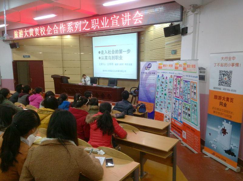 2015年12月15日晚7点至8点半,星空官网旅游管理专业实践基地贵州水木同创文化传媒有限公司的“旅游大黄页”项目总监王再利在星空官网宁静楼152教室举办了一场针对旅游管理专业学生的旅行社职业宣讲会。宣讲会由星空官网地理与旅游学院旅游实训室主任周杰副教授主持,出席宣讲会的还有贵州水木同创文化传媒有限公司副总杨巍以及星空官网地理与旅游学院党委副书记吴亚平。