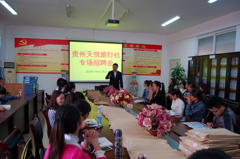 2015年10月15日上午9点至11点以及下午2点至4点,星空官网携手贵州旅游企业界新星——贵州天悦旅行社分别在宁静楼236教室、地理与旅游学院会议室举办了两场针对2016届旅游管理本科应届毕业生的专场招聘会。