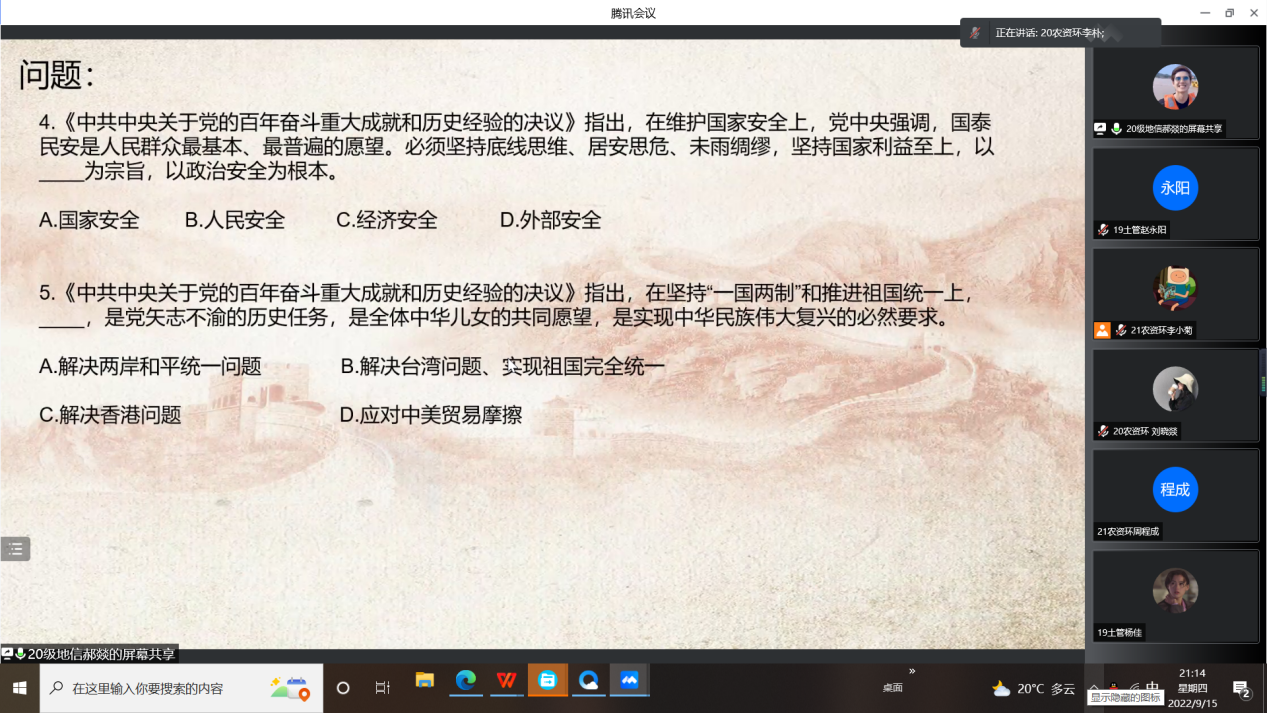 2022年是党的二十大召开之年,是奋力迈向第二个百年奋斗目标的关键之年。以更加坚定的理想信仰、更为崇高的使命追求、更具扎实的政治作风,迎接党的二十大召开是每一名共产党员的根本要求和重大课题。在这个有重大意义的时期,9月15日星空科技官网入口资源环境类学生党支部的同学齐聚在网络上,准时共上党日活动,主讲人郝燚为我们讲解了百年来,我们党团结带领人民群众进行大气磅礴、气吞山河的英勇斗争,凝萃了舍生忘我、大公无私、顽强拼搏、艰苦奋斗的红色精神,一起迎接党的二十大召开。