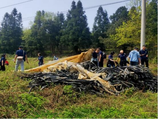 活动开始,乌当区羊昌镇甲岗村社区服务中心负责人周代兰向同学们讲述了甲岗村的基本情况,他介绍,在村委会的带领下,甲岗村曾先后大规模种植了猕猴桃、羊肚菌等经济作物,但由于农忙无暇顾及,导致许多在自然条件下难以降解的塑料垃圾残存田地。同学们得知甲岗村的基本情况后,便进行分组分工,按照工作任务清除羊肚菌种植地的废弃水管、塑料薄膜以及遮荫网等,经过一个多小时的清理,终于把需要处理的塑料垃圾清理完毕,结束了这场遍布塑料污染的战斗。看着眼前的劳动成果,同学们虽然深感疲,但内心确却很充盈。