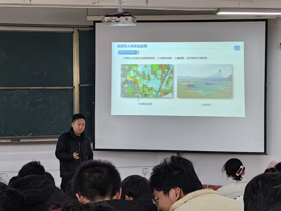 在讲座的第二部分,祝老师结合农业资源与环境专业的特点,深入讲解了无人机在农业中的具体应用和数据处理方法。他提到,无人机通过搭载先进的传感器和摄像头,可以对农田进行高精度的监测和测绘,为农民提供土壤水分、养分含量以及病虫害发生情况等关键信息。这些信息对于实现精准施肥、精确灌溉和病虫害早期预警具有重大意义,有助于提升农业生产效率,减少资源浪费。此外,祝老师还向同学们展示了无人机在播种、喷洒农药和采摘等农业操作中的实际应用。通过无人机的自动化操作,不仅可以大幅减少劳动力成本,还能提高作业精度和效率,为农业生产的现代化和智能化提供了有力支持。