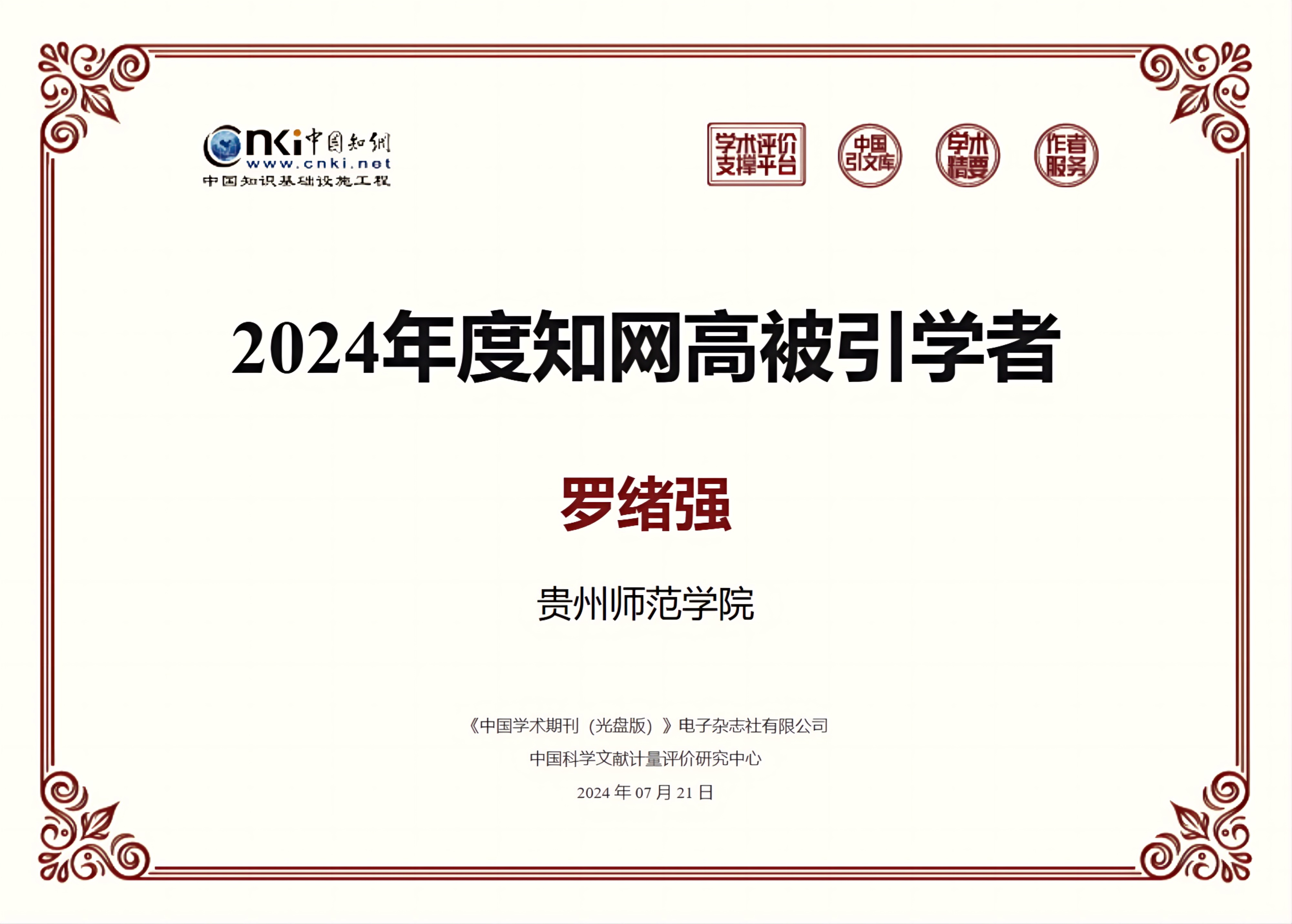 近日,中国知网发布了2024年度高被引学者名单。星空官网三级教授罗绪强成功入选。据悉,此次评选由中国知网“学术精要”数据库依据2013-2023年间学者发表论文的影响力指数进行评选,“高被引学者”遴选范围为近十年发表至少一篇PCSI指数高于1.65期刊或会议论文的学者,且近十年发表期刊会议论文的PCSI指数之和位于上述学者的前1%,并满足以下条件:(1)仅统计PCSI指数大于1.65的论文;(2)至少发表1篇高影响力论文;(3)至少发表5篇PCSI指数大于1.65的论文。