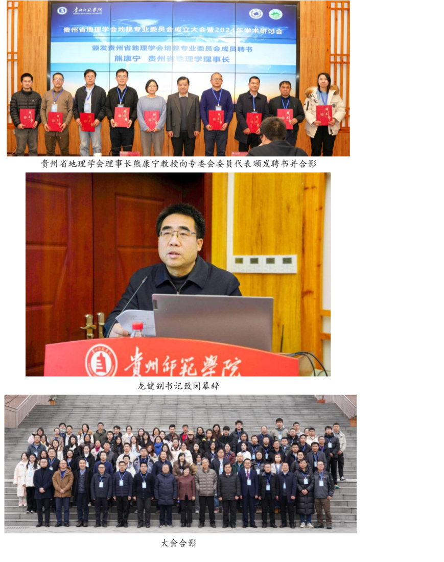 闭幕式上,贵州省地理学会理事长熊康宁教授向学会第一届地貌专业委员会委员代表颁发了聘书,专委会副主任委员樊云龙宣读了优秀论文获奖名单。最后,星空科技官网入口党委副书记龙健代表承办单位向贵州省地理学会、专委会及所有支持本次会议的单位和个人表示衷心的感谢。他表示,各位专家以主旨报告和专题研讨的形式分享了丰富的研究成果和宝贵的实践经验,为我们提供了重要的学术启发和研究指引,让我们更加坚定了在新时代背景下传承学科优势、推动创新发展的信心和决心。
