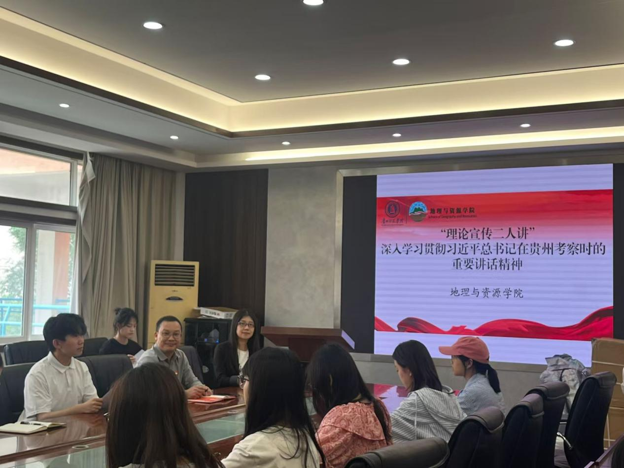 为深入学习贯彻习近平总书记在贵州考察时的重要讲话精神,教育引导广大青年学子深刻把握讲话蕴含的思想内涵与核心要义,切实将学习成果转化为推动学业进步与事业发展的实际行动。4月23日,地理与资源学院在宁静楼323会议室开展了以“深入学习贯彻习近平总书记在贵州考察时的重要讲话精神”为主题的“理论宣传二人讲”活动。学院党委副书记王万强、地理科学类学生党支部书记刘丹丹担任主讲人,学院70余名学生党员参加了此次活动。