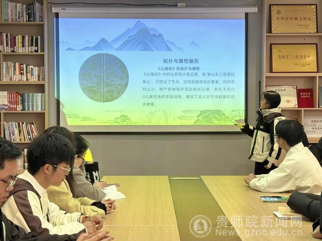 地理信息科学专业的同学以《山海经》为灵感原点,结合《徐霞客游记》中详实的实地考察记录,提出了“用空间分析技术还原古典地理叙事的虚实边界”的独特构想,将神话想象与实证探索通过技术手段巧妙联结,尽显学科交叉的创新张力。自然地理与资源环境专业的同学借《变化中的自然地理学性质》,解析了学科“解释性、跨学科、人地互动”的演化维度,展现了地理与文化、实践的深层联结。农业资源与环境专业同学结合《神州》一书,分享了地理格局与农业文明的互动关系,以及专业在资源利用、环境保护中的历史使命与现实价值。地理科学专业的同学则聚焦《徐霞客游记》的科学考察内核,对照《山海经》的浪漫主义地理书写,从观测方法、认知逻辑、叙事风格三个维度展开对比,剖析了中国古代地理认知从“想象建构”到“实证探索”的演进脉络。新生们的分享虽稍显青涩,但其中闪现的跨界灵感、强烈的探索欲以及敢于打破学科壁垒、主动关联古今的勇气,同样赢得了全场喝彩,也让在场的学长学姐看到了青年学子传承地理文脉、开拓学科视野的蓬勃潜力。